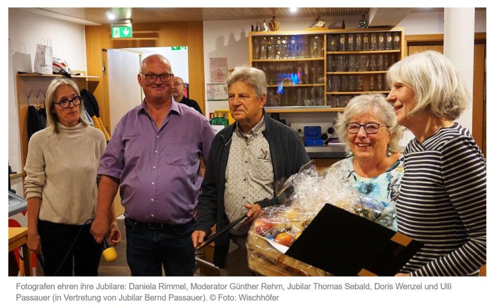 Zwei Urgesteine des Fotoclubs wurden an diesem Abend mit einer Urkunde und einem großen Präsentkorb geehrt. Bernd Passauer für 45 Jahre und Thomas Sebald für 35 Jahre Mitgliedschaft im Verein. In Abwesenheit von Bernd Passauer nahm dessen Frau Ulli Passauer die Ehrung entgegen.