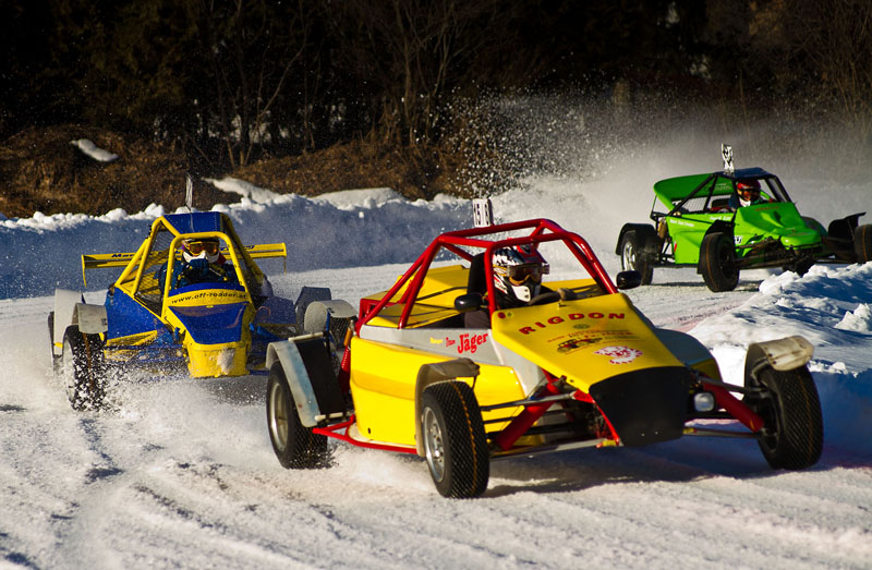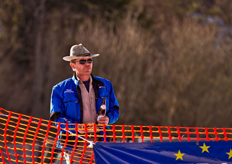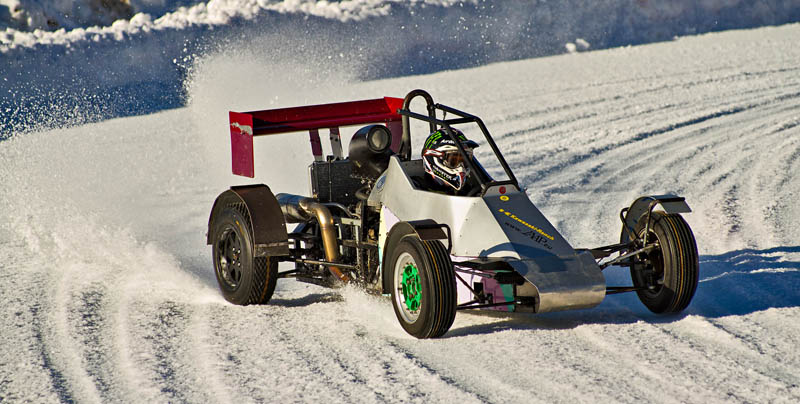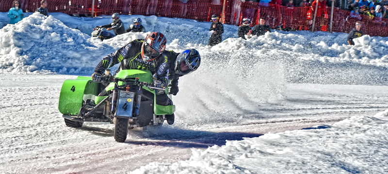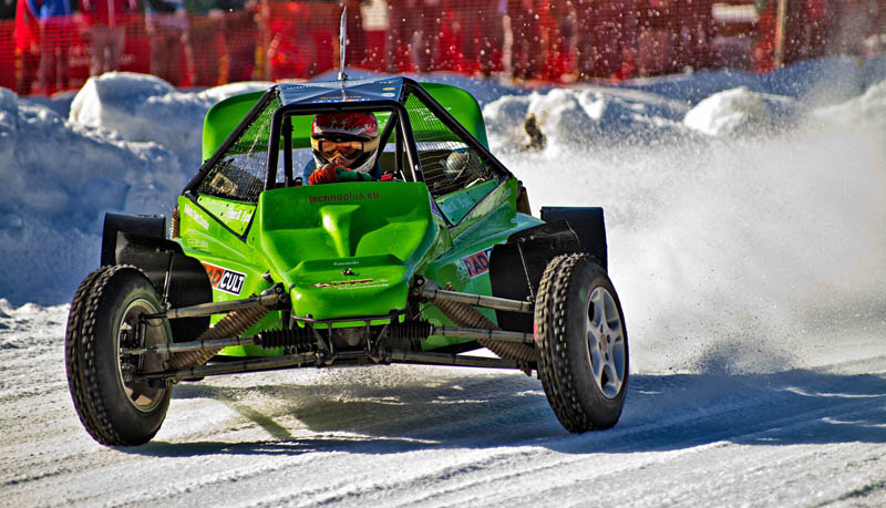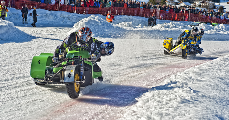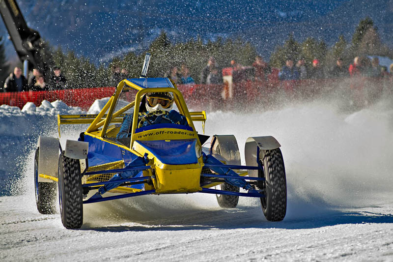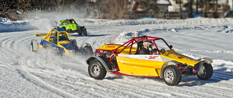 Ach ja, noch mal zur Piste: Vor Beginn des Rennens hätte man den Rundkurs, der mit einer 50 cm dicken Eisschicht präpariert war, gut mit Schlittschuhen befahren können. Aber schon nach wenigen Runden mit Spike-Reifen glich er eher einer abgenudelten Ski-Piste und musste immer wieder mit Schneepflügen abgezogen werden.
