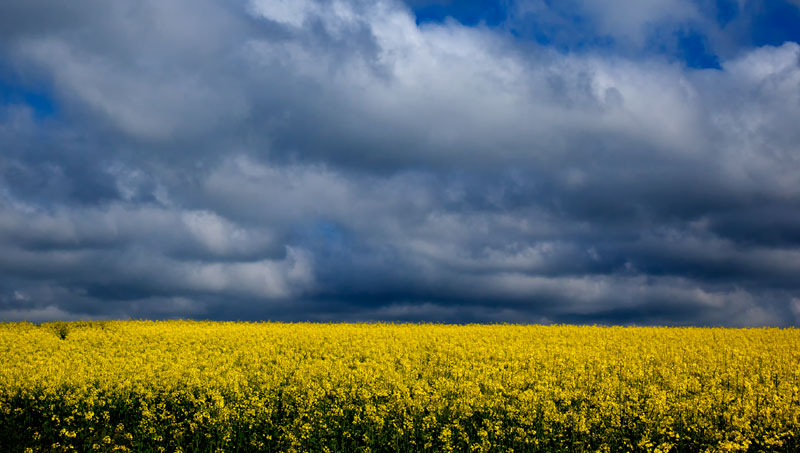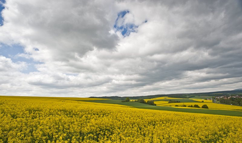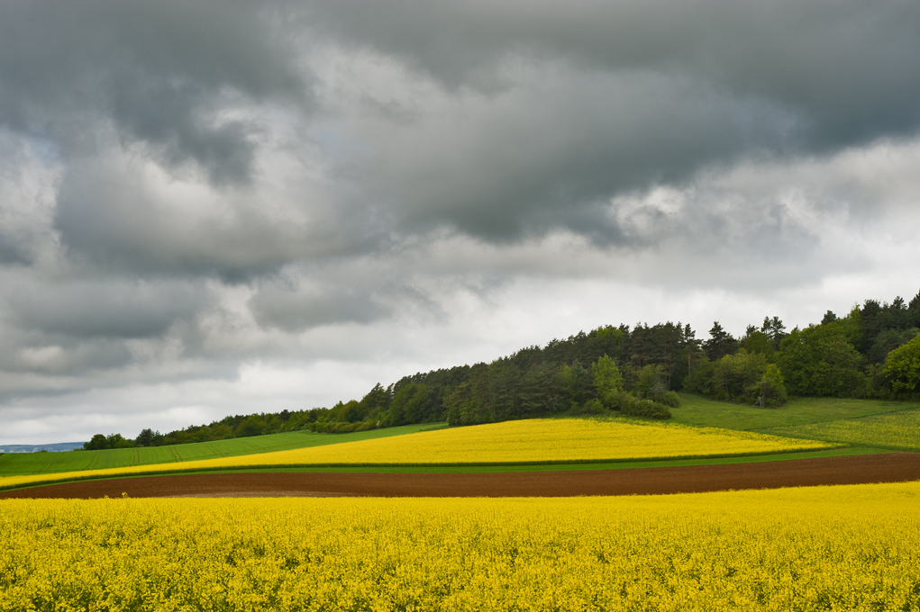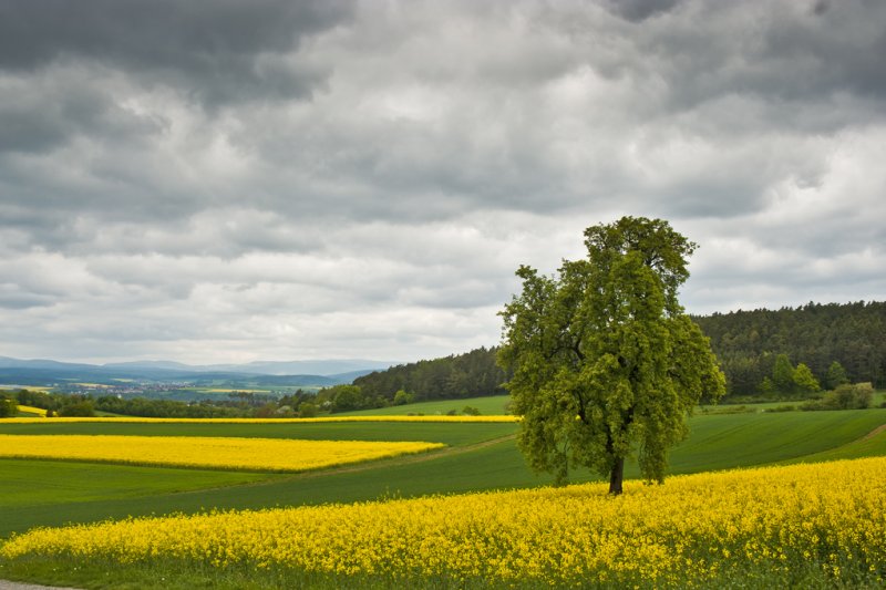 Das Wetter war zum Fotografieren ideal: Dramatische Wolken durch die immer wieder die Sonne die Rapsfelder in strahlendes Gelb getaucht hat.