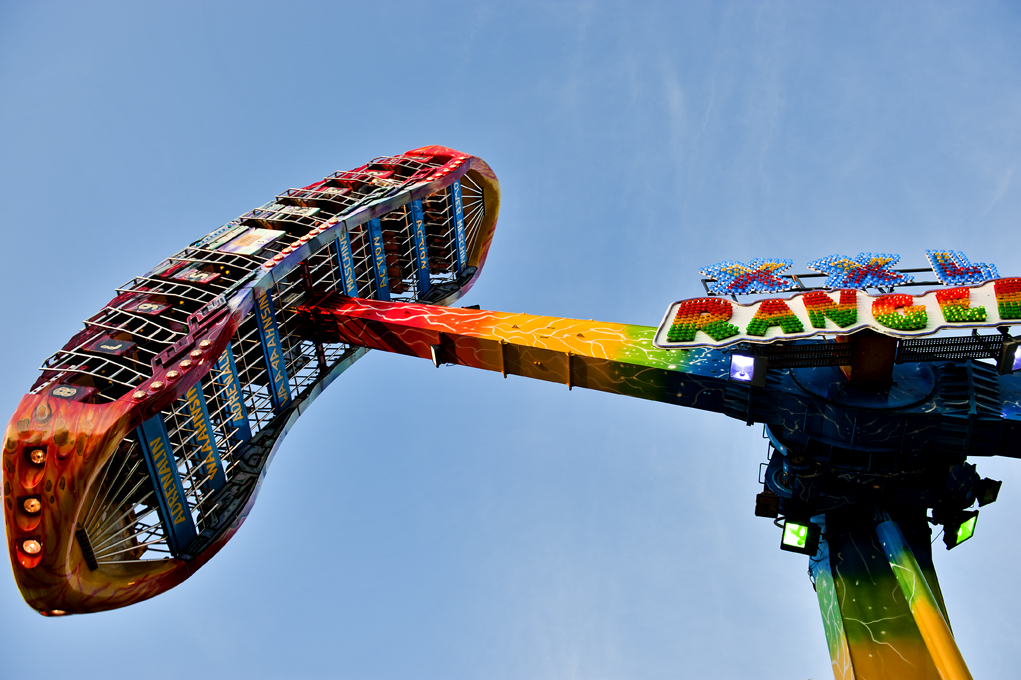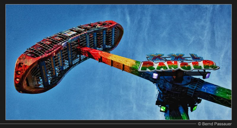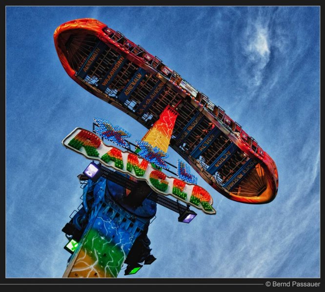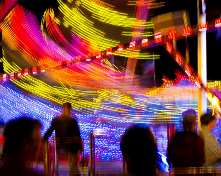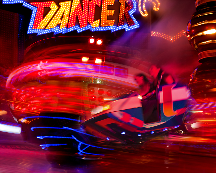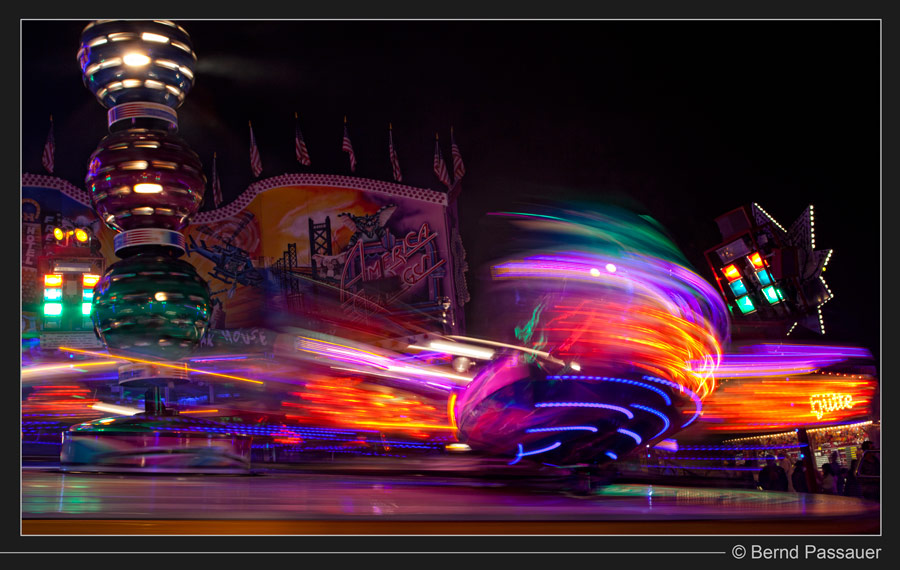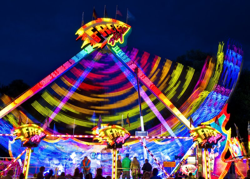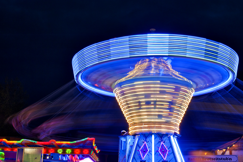 Schöne Motive geben auch die Lichter der Fahrgeschäfte am Abend ab.
