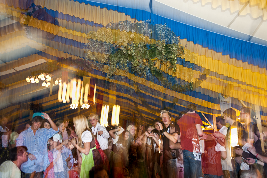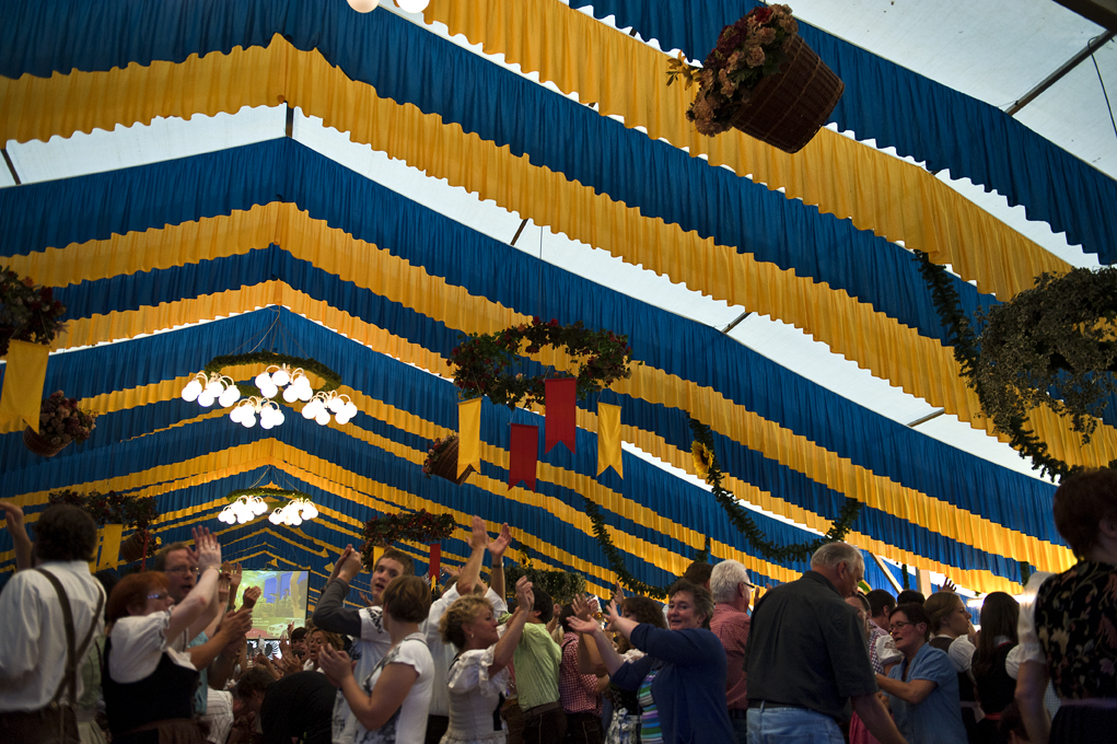 Inzwischen herrscht auch im Bierzelt Hochbetrieb, der Bretterboden bebt.